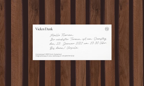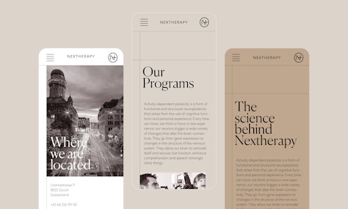 Swiss-based Nextherapy approached Studio WillemsPeeters to create a unique branding for their new state-of-the-art clinic in Zurich. Nextherapy needed a brand identity that claimed its position as a state-of-the-art rehabilitation clinic. Their new identity gives Nextherapy’s logo, colour palette, images and communications a stylish and timeless look and feel, positioning them as the leading rehab center that shifts the conversation from an impersonal experience to a personal one, rooted in the best neuro therapies available.